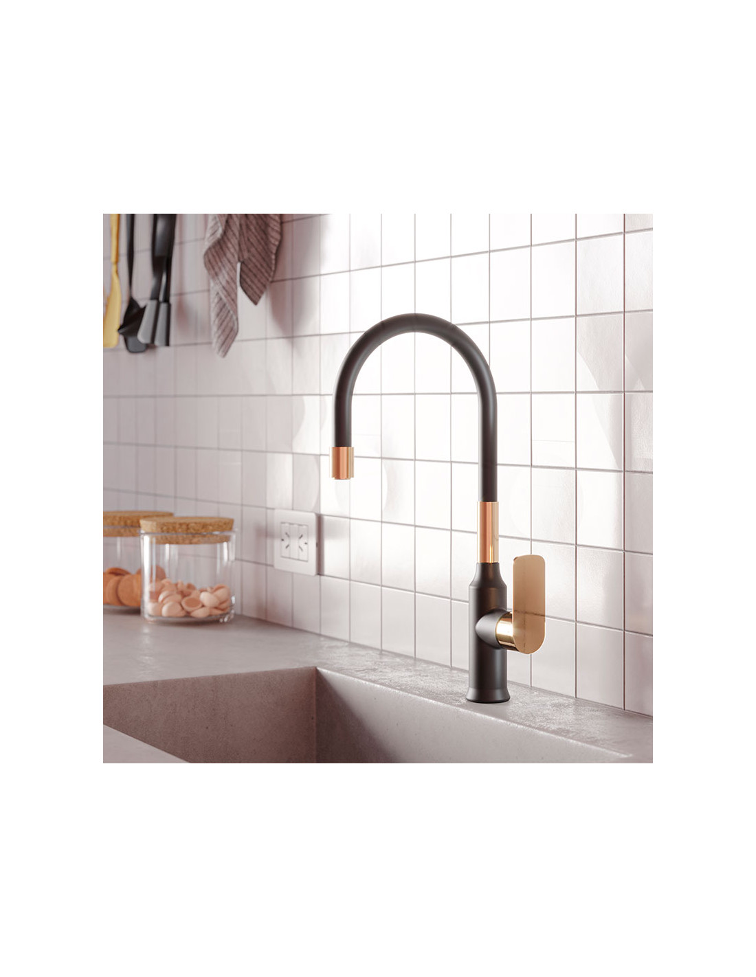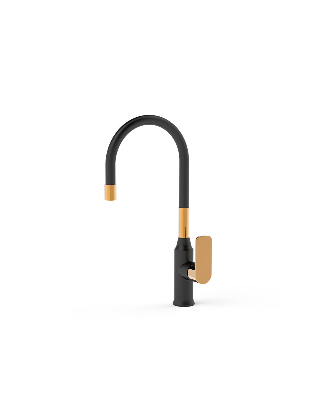 Agatha - Juego negro y dorado monocomando para mesada de cocina con pico flexible.