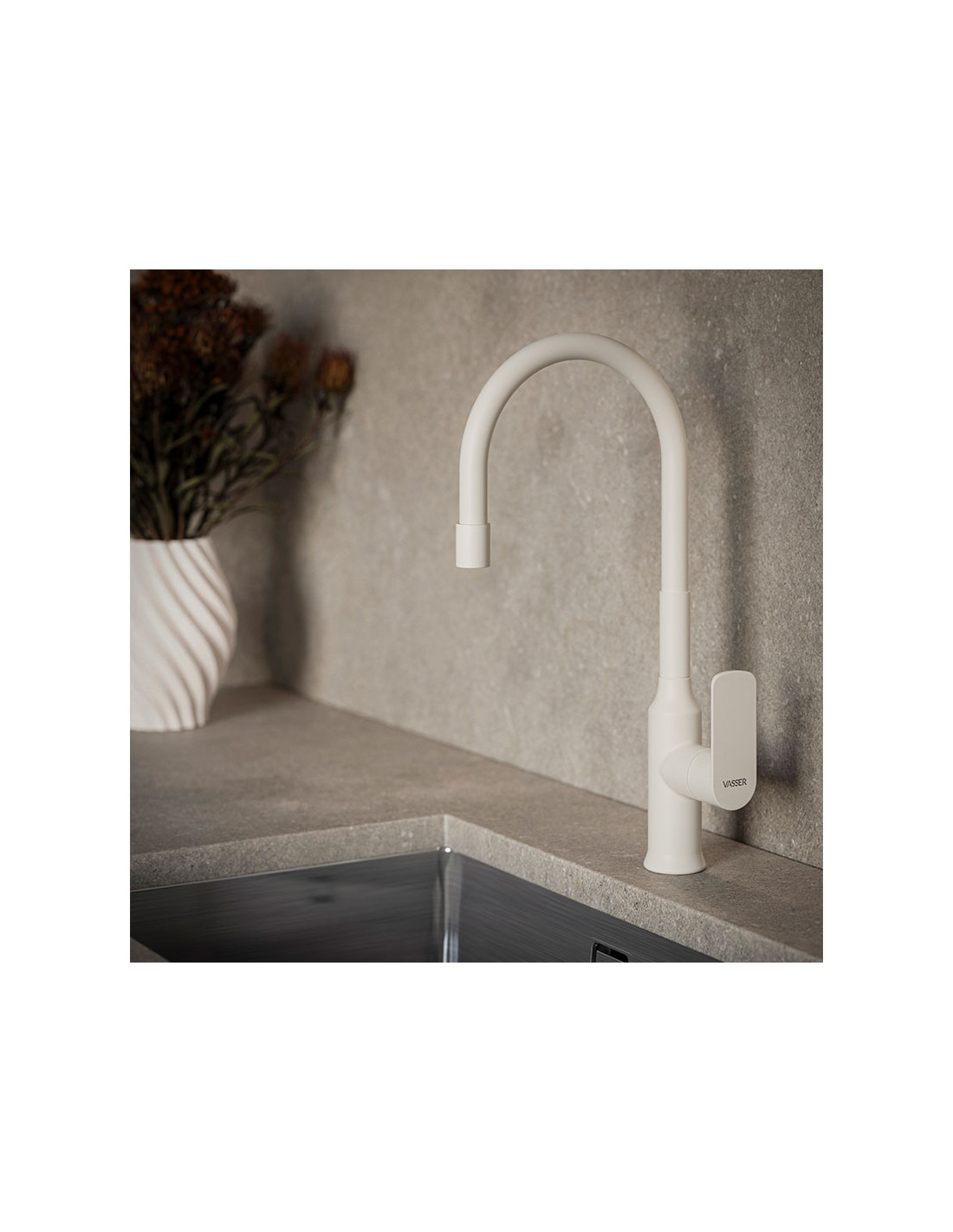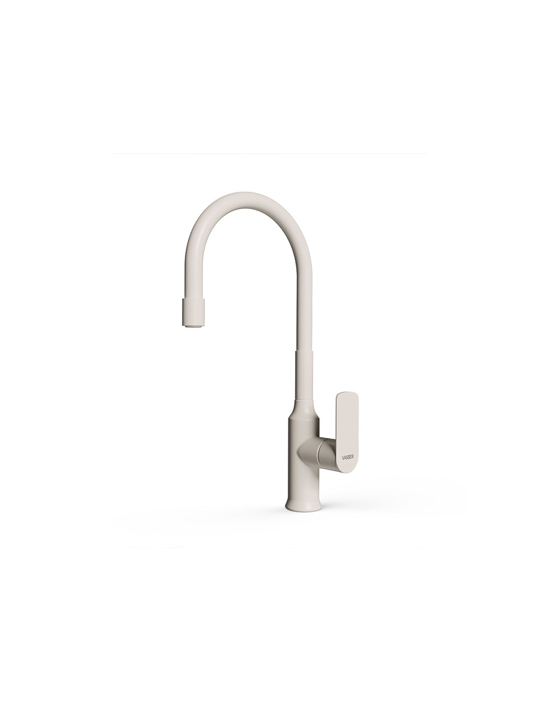 Agatha - Juego blanco monocomando para mesada de cocina con pico flexible.